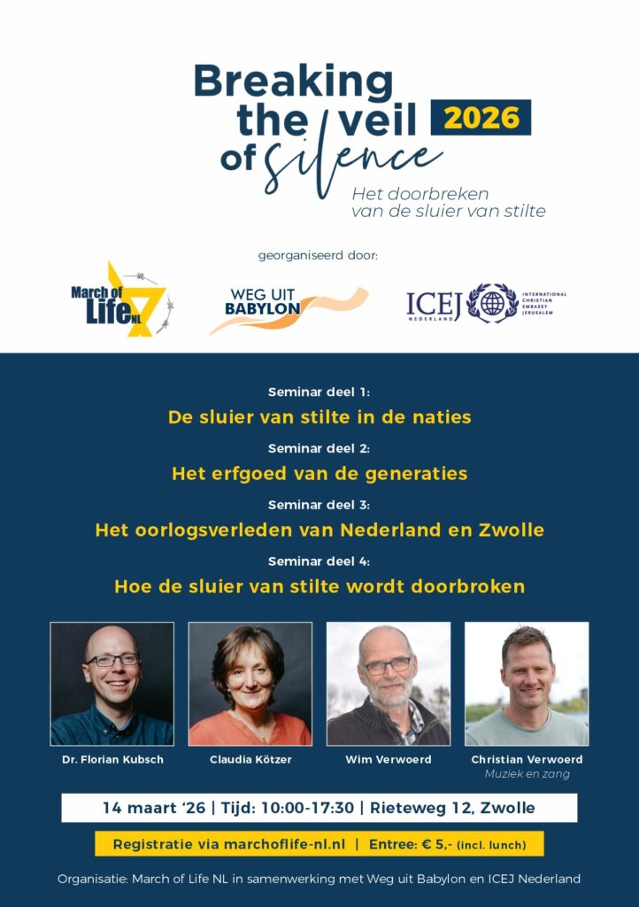 Dit keer geen ochtend, maar een speciale hele dag! Dit is een ochtend in samenwerking met ICEJ Nederland op Zaterdag 14 maart 2026 van 10:00 tot 17:30 uur: Breaking the veil of silence (March of Life NL). Dit is in samenwerking met Weg uit Babylon. Sprekers zijn Florian Kubsh en Claudia Günther uit Duitsland (team March of Life) en Wim Verwoerd. Christian Verwoerd zal met muziek en zang begeleiden. Lees meer in uitgebreid bericht op onze website.