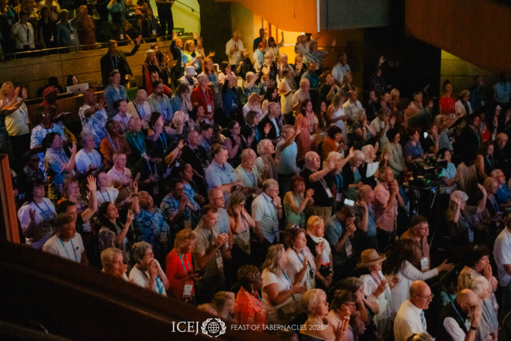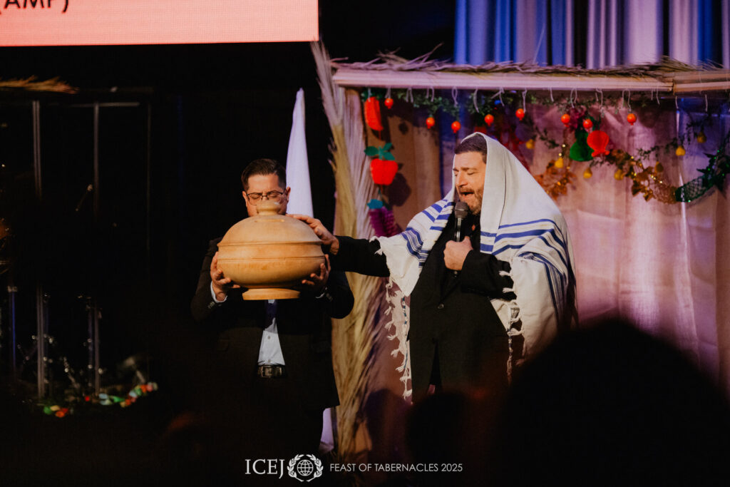 De slotavond van het Feest was gevuld met geloof, vreugde, genezing en een diep gevoel van de aanwezigheid van de Heer. NORTHWORSHIP uit Noorwegen leidde de aanbidding en ICEJ-voorzitter Dr. Jürgen Bühler opende de avond met een terugblik op de overweldigende respons op de Israëlische Gastenavond die eerder deze week werd gehouden in het Internationale Conferentiecentrum in Jeruzalem, waar elke stoel bezet was. ” Wat een krachtig getuigenis van Gods trouw onder de volken”, zei hij dankbaar. Dr. Bühler onthulde vervolgens het thema van het Loofhuttenfeest van volgend jaar: “De leeuw brult vanuit Sion”, gebaseerd op Joël 3:16. De gemeente reageerde feestelijk op de aankondiging, terwijl de aanbidding de zaal vulde in het Hebreeuws en Engels. De lucht was gevuld met verwachting voor wat God het komende jaar nog zou doen.