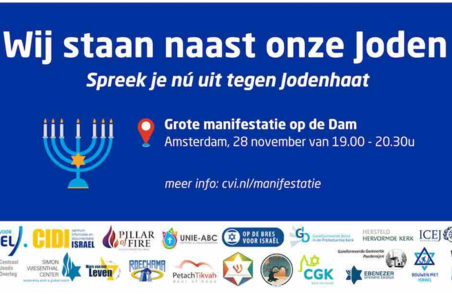 Christenen voor Israël wil, in samenwerking met diverse Joodse en christelijke organisaties, een krachtig signaal afgeven tegen Jodenhaat. Op donderdag 28 november om 19.00 uur komen we samen op de Dam in Amsterdam, om onze solidariteit te tonen met de Joodse gemeenschap. Onder het motto: ‘Wij staan naast onze Joden’, willen we gezamenlijk opstaan tegen antisemitisme en Jodenhaat.