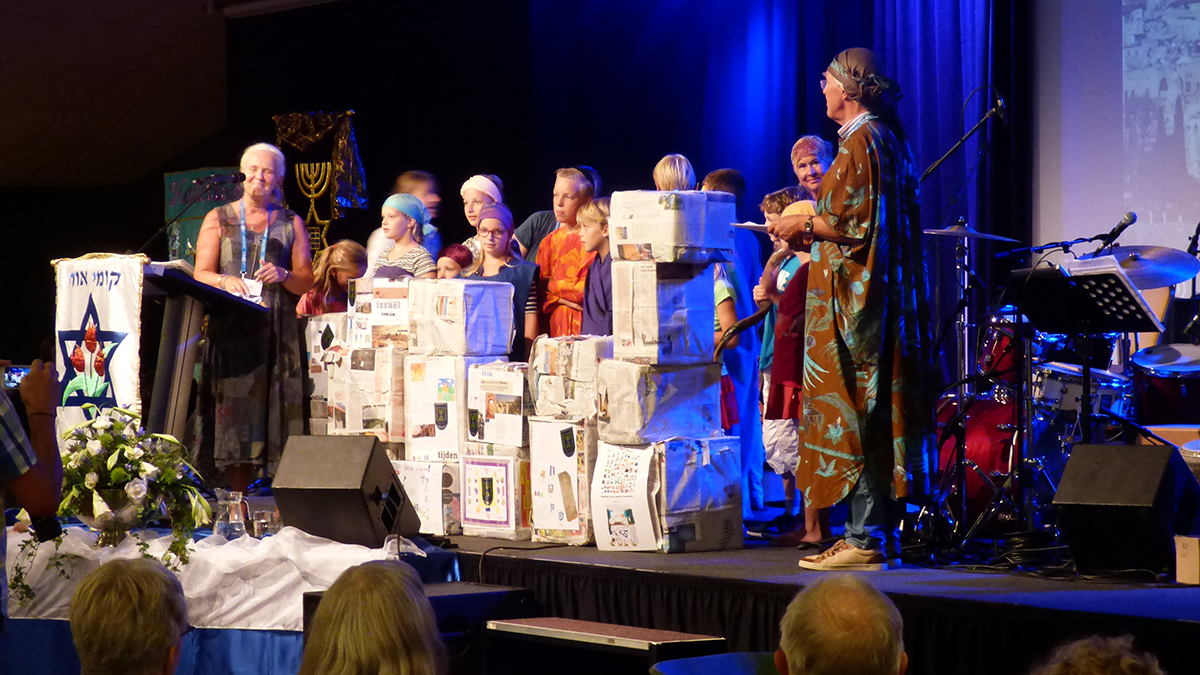 We hadden ’stenen’ (luierdozen) verzameld, om zo de kinderen bij het bouwen te kunnen betrekken. Nehemia (Rintje) nam de kinderen mee door het verhaal. Vrijdag hebben we het verhaal uitgebeeld dat Nehemia bij de koning komt en droevig is, omdat het niet goed gaat met zijn volk en de stad Jeruzalem. ´s Zaterdags hebben we met elkaar de muur herbouwd. Gedurende het hele weekend konden de kinderen aan een muurkrant werken, die later gelamineerd werd en als placemat gebruikt kan worden. De bovenbouw-kinderen hadden een extra uitdaging: zij mochten een aantal mensen interviewen m.b.t. Nehemia. Het was leuk om te zien hoe enthousiast ze waren om deze opdracht uit te voeren. Op zondag vierden we het Loofhuttenfeest, nadat Ezra de wet had voorgelezen: Eerst werd er gebouwd, daarna werd het volk bepaald bij de wet van God, waarna feest gevierd kon worden!! Met elkaar hebben we volgens Joodse traditie alles voorbereid: De jongens hielpen met het inrichten van de loofhut, de meisjes hielpen met het klaarmaken van lekkere snacks voor in de loofhut. Er was ook van de volwassenen veel belangstelling voor deze prachtige loofhut! Zondagmiddag hebben we op het podium kort laten zien wat wij het weekend hadden gedaan, onder het zingen van het liedje: “Aan het werk” van Elly en Rikkert. Daarna werden de kinderen nog gezegend onder de choepa, een waardige afsluiting van een prachtig weekend.