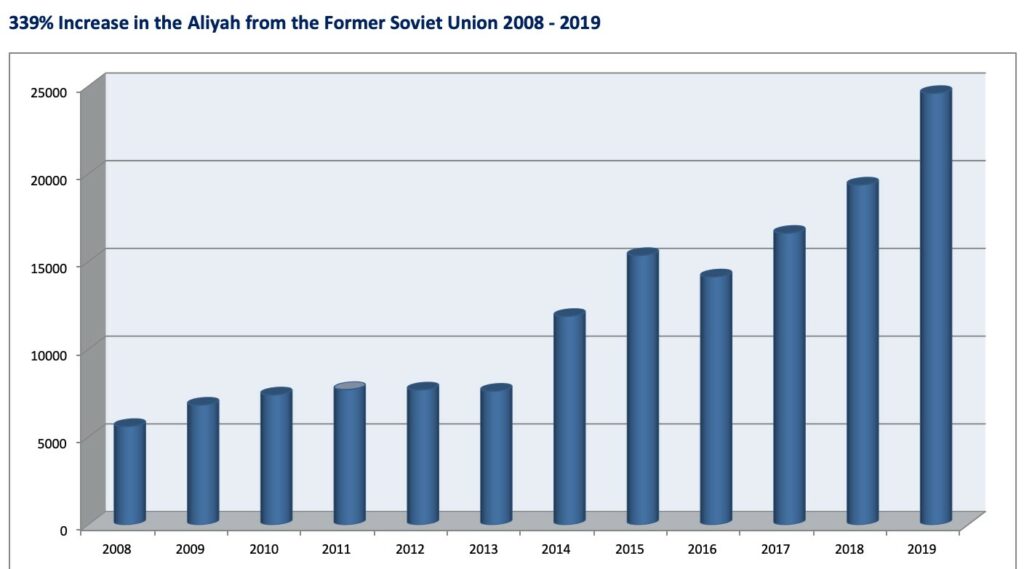 Als we de officiële gegevens nader bekijken, is het grootste deel van deze toename van de Joodse immigratie naar Israël dit jaar te wijten aan de oorlog tussen Rusland en Oekraïne, aangezien ongeveer 40.000 van de nieuwkomers sinds eind februari uit die twee landen kwamen. Tussen januari en eind augustus 2022 kwam 47 procent van de nieuwe immigranten uit Rusland en 25 procent uit Oekraïne.