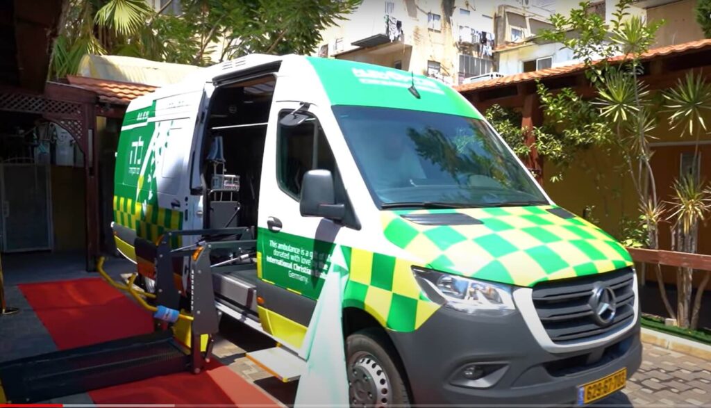 Hoofdfoto: Een ICEJ-delegatie overhandigt vorig jaar een op maat gemaakte ambulance om ernstig gehandicapte kinderen te helpen in het ALEH-zorgcentrum in Bnei Brak (de gezichten van kinderen zijn vervaagd in overeenstemming met de Israëlische wet).